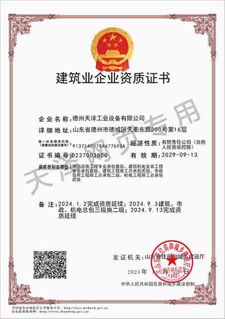 德州天澤工業(yè)設(shè)備有限公司成立于2003年(前身為德州天元集團天明工業(yè)設(shè)備安裝公司),經(jīng)過20多年的發(fā)展,現(xiàn)成長為擁有職工600余人,各類專業(yè)技術(shù)人員近300余人,年生產(chǎn)能力兩億元以上,以建筑機電安裝工程、消防設(shè)施安裝工程施工為主,集建筑工程施工、市政工程施工、建筑智能化工程施工、園林綠化工程施工、工程管理服務(wù)、物業(yè)管理、電氣機械設(shè)備銷售等多元化經(jīng)營于一體的綜合型企業(yè)。2005年,企業(yè)按照國際標(biāo)準(zhǔn)建立的質(zhì)量管理體系,通過了ISO質(zhì)量管理體系認證、環(huán)境管理體系認證、職業(yè)健康安全管理體系認證。施工工程遍布山東、河北、四川、江蘇等地,最具代表性的工程有:山東省德州市百腦匯資訊廣場機電安裝工程、德州經(jīng)濟開發(fā)區(qū)天元大廈機電安裝工程、陵城區(qū)人民醫(yī)院機電安裝工程、德州金魯班大廈機電安裝工程、河北故城金辰小區(qū)機電安裝工程、北川地震災(zāi)后援建工程等。多年來,公司始終堅持“以人為本,建精品工程,創(chuàng)行業(yè)品牌”的經(jīng)營理念,先后榮獲。ㄊ校┘壧┥奖、天府杯、魯安杯等獎項,申報各種功法、多項專利。